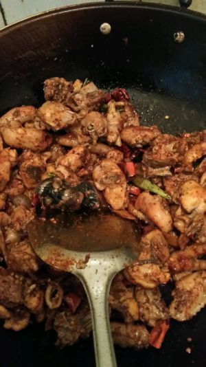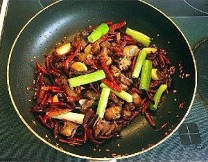 放油,油热了干辣椒放下炒,然后放花椒,姜片,蒜。这是盐和鸡精一起放下去,便于提味。必须小火不然辣椒糊掉了,把辣椒炒碎吻到香就可以放鸡肉下锅了
