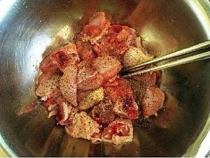先把鸡胸脯肉切成丁状,加入料酒,盐,胡椒粉,鸡精,淀粉拌匀,搁置十到十五分钟。