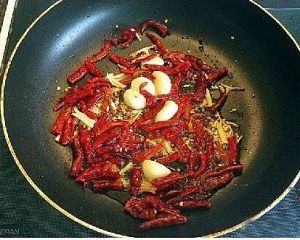 再放入之前剩下的葱姜蒜头干红椒翻炒