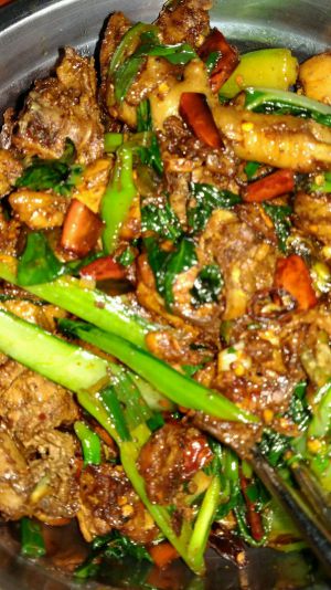 菜心放后,翻炒一会看到菜变嫩了,将小葱放下锅,翻两翻就可以起锅了。一道香碎麻辣的菜心辣子鸡出来了!