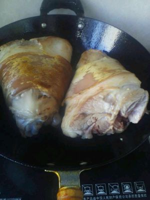 快入猪肘子,炒至有糖色后倒入料酒,然后加水,水要没过猪肘子。接着放桂皮,小茴香,大火烧开水后,转小火慢炖至收汁。第一次脱脂完成。