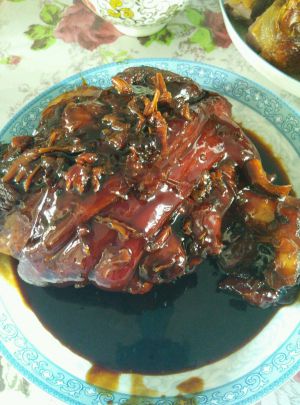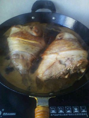 收汁后把猪肘子捞出,然后放锅里蒸至肉烂,这做法叫第二次脱脂。