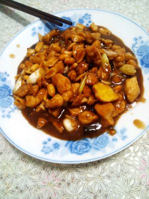 之后加入胡萝卜翻炒一会,再加入黄瓜,花生米翻炒一小会,再加入炒好的鸡肉,翻炒均匀,最后加入调好的酱汁倒入锅中,翻炒出锅