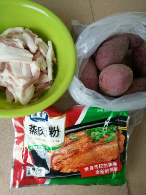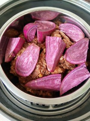 把肉片摆在碗底,上面码上紫薯块。入蒸锅,大火蒸50分钟!