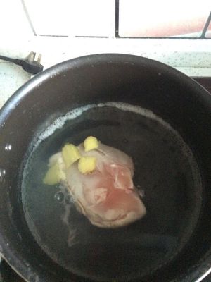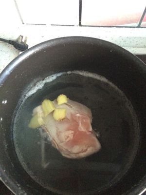 买回来的鸡先清洗一下,准备一锅水,放入姜两三片,水煮开放入半只鸡,适量料酒。盖锅盖等候