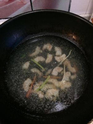 虾仁用盐胡椒蛋清抓抓~放入烫蔬菜的水里烫熟~取出待用