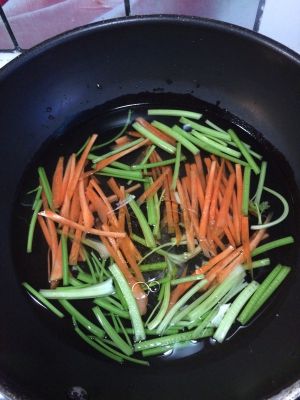 大火 加入各种大料爆香 转小火 加入鸡丝 一起鳊炒