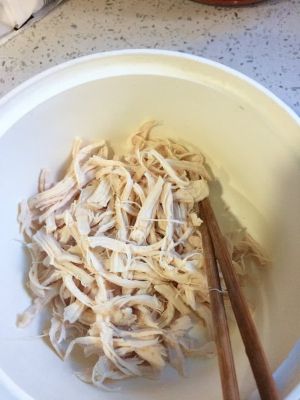 用厨房纸吸干水分,手撕鸡启动啦……省略一万个字哈哈哈,一定要按照纹路来撕它,别问为什么