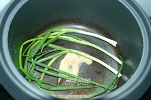 电饭锅底放上一块鸡肚子里的鸡油(没有就不要了),把葱和姜片平铺在电饭锅底. (我没有铺姜片,导致最后锅底的调料汁结牢,有点焦,锅子难洗,所以建议你们做的时 候把姜片和葱铺满底部,可以防止结底)