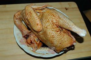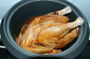 把腌制好的鸡放进铺好姜片,葱和鸡油的电饭锅,同时把腌制的调料也一起倒进去,在 鸡身上淋一勺色拉油,插电,按下煮饭键,等.............,等到电饭锅跳起,过十分钟开锅,取 出鸡,撕.吃的时候可以配上你喜欢的蘸料,我是用姜末,蒜末,姜汁,几滴生抽,一点点糖 和多多的麻油拌在一起,淋在撕好的鸡上,非常好吃.