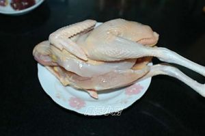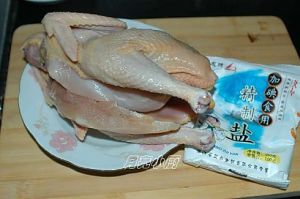 用盐薄薄的在鸡身上抹一层,鸡肚子里塞上两片姜片,静置五分钟.