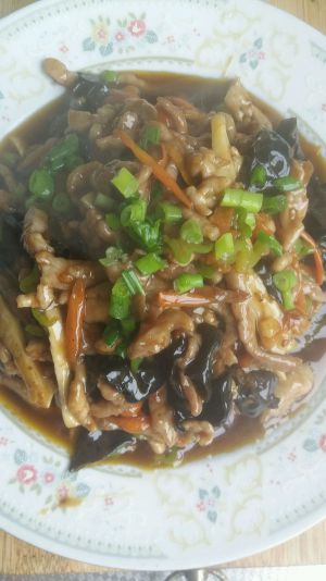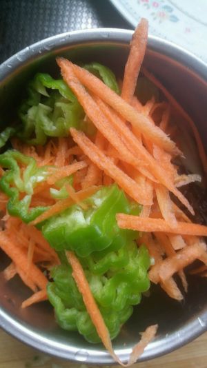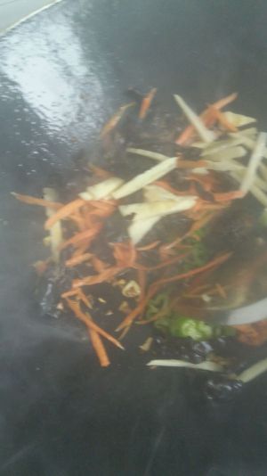 准备:胡萝卜、秋耳、莴笋切丝、大葱切小、老姜切丝、里脊肉切丝以后用盐、红薯淀粉加清水上浆备用