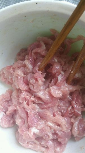 里脊肉洗干净后顺纹理切丝少量淀粉、料酒、酱油抓匀待用。