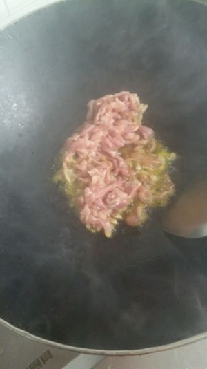 锅里油热倒入腌制的肉丝煸炒至白、 加入葱姜蒜炒出香味
