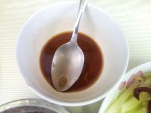 3,【很重要】糖醋汁的调法。空碗加两勺醋,一勺生粉,一勺白糖,搅匀。备用(一定要事先调好,不然炒菜的时候手忙脚乱的)