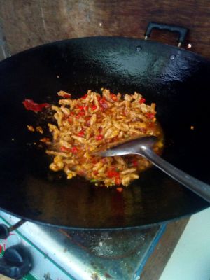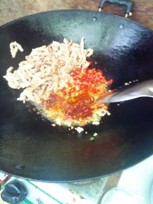 5,肉丝要断生时,用锅铲把肉丝推向一边,开大火,然后倒入姜蒜沫,爆香,在倒入郫县豆瓣酱,泡辣椒,爆炒。
