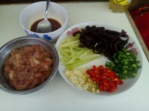 现在发教程,材料准备好:木耳,辣椒,红萝卜,瘦肉都切丝,肉丝里放些十三香,用淀粉抓抓先腌一会
