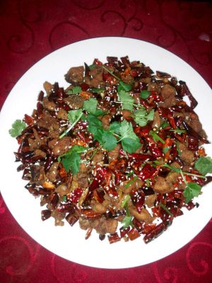 热锅倒油将上好浆的鸡肉炸至外酥里嫩然后倒出,锅中加水将干辣椒焯水然后炒锅倒油放干辣椒葱花姜片煸炒出香味,放入炸好的鸡块继续煸炒至辣味熏鼻,即可装盘最后撒上芝麻香菜即可开造。
