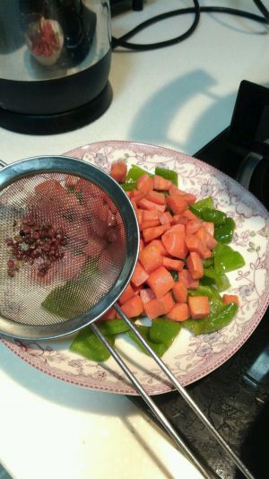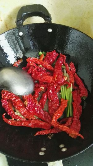 将干辣椒,花椒,葱白部分 (最好用大葱,家里没大葱了,只能用小葱),姜下锅煸炒。