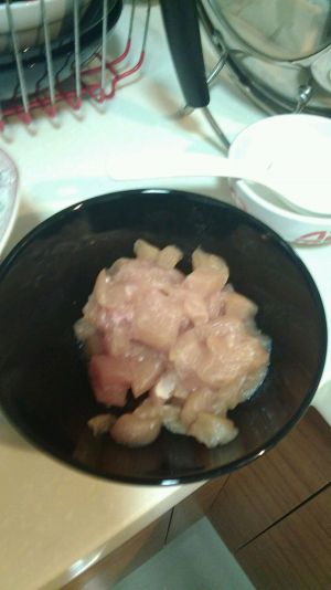 淀粉撒入鸡胸 加少许料酒 拌匀