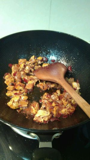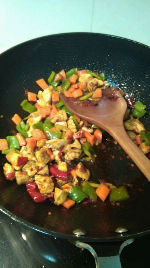 另锅,油热,葱姜蒜入干辣椒,花椒或麻椒,煸出香味,入鸡块翻炒,撒白芝麻,葱花出锅。2、3分钟即可,时间长,辣味会重些。