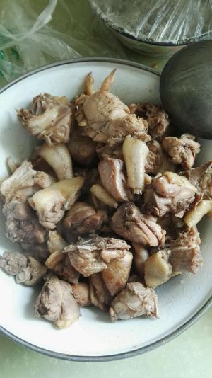 鸡腿切适当大小。不用去骨。放料酒。五香粉。盐{多一点}研制半小时。葱,姜。辣皮子。蒜适量