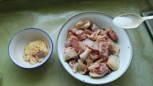 将剁好的鸡块腌制放盐,味精,胡椒粉, 料酒腌制20分钟打鸡蛋加淀粉上浆,