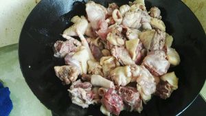 煸出香味后将鸡块放入锅内一同煸炒,加老抽,冰糖,盐