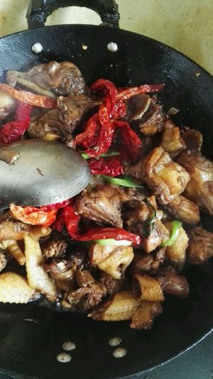 锅热倒油,油多点,加八角花椒干红辣椒5个,葱姜蒜,倒入鸡翻炒十分钟至变色。倒入一平铲醋继续翻炒5分钟,倒入2平铲老抽,1勺甜面酱,炒至入味,加开水没过鸡,盖盖子最后收汁,加盐出锅