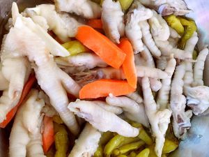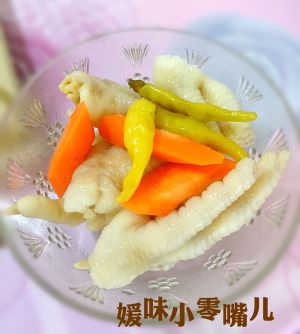 超市购买的罐装泡椒加入凉白开,盐,糖,调味。将煮好的鸡爪以及胡萝卜条浸入汤汁中。第二天食用,味道更加佳。