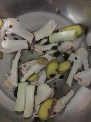 锅里放足够的水,鸡脚冷水下锅,放姜片,一小勺盐,3勺料酒,煮到断生去浮末,不用太烂,有点嚼劲更好吃!