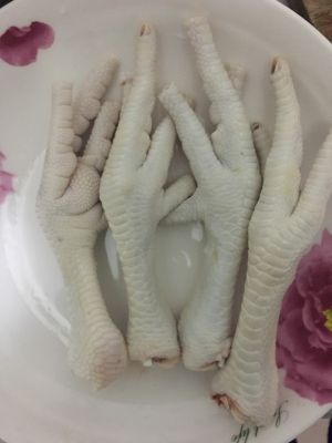 鸡爪买来解冻。把鸡爪尖剪掉。放入锅中煮熟,放入老姜,料酒去腥。煮熟后捞起,用冷水快速冲几遍,直到鸡爪变凉。