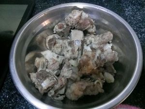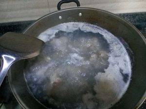 排骨冷水下锅, 放入两片姜,煮出浮沫后捞出;