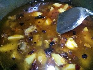 4.锅中放一点点油,依次放入豆角和土豆翻炒至断生,加入适量水5.排骨捞出放入,少放几勺排骨汤(为了提味,放多了太油腻),加入生抽八角和咖喱,加盖焖十五分钟左右至汤汁粘稠