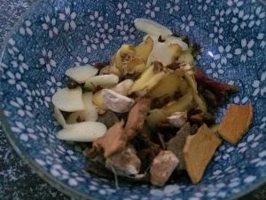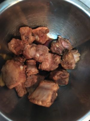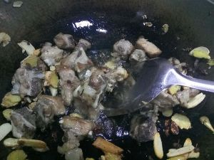把排骨以及准备的配料倒入热油中,大火翻炒,直至排骨颜色如图