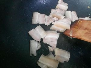 热锅下肥肉部分,因为肥肉很容易出油的,所以我就没有再放油了,直接用食材本身的油脂。