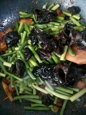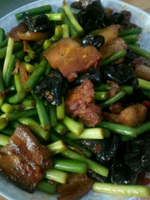食材准备:煮熟的五花肉切片,葱切段,姜切丝,木耳泡发,蒜苔切段。注:洗净的五花肉,凉水下锅,放入一小块拍碎的姜,煮至用筷子能插透肉时捞出晾凉再切片。