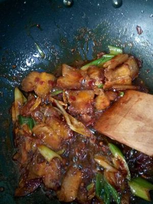 待肥肉部分煸至透明时放入葱姜煸炒均匀,放入豆瓣酱、少量老抽翻炒均匀。注:火要小哦!