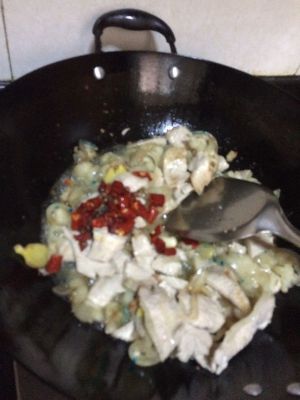 排骨煸好后,放入切好的辣椒,爆炒几下,再放入千张,