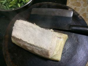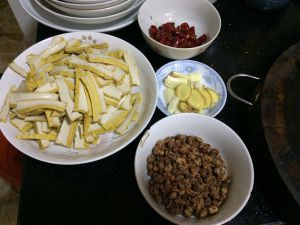 豆腐干切片备用,干辣椒与花椒粒过下水沥干备用,姜切片,蒜瓣拍碎,豆豉1两备用(我用的豆豉是我们这里老工艺制作的,比市面上卖的袋装的更加香而且也没有化学添加剂)