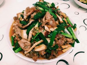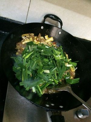 加入蒜苗翻炒两分钟,加入鸡精、味精少许,再次翻炒一分钟就可以起锅装盘了。