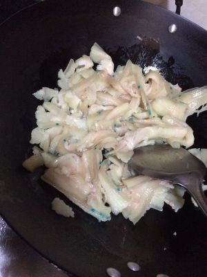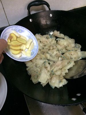 肥肉微微起卷放入姜片和蒜瓣爆香!