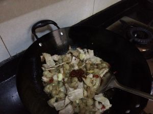然后加入干辣椒段和花椒粒,因为过了水所以不容易炒焦。