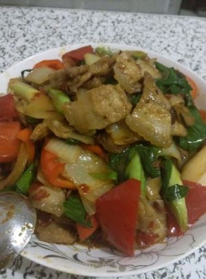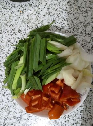 蒜苗切段,洋葱切块,柿子椒切块,柿子椒是用手扳来的,据说这样味道纯正!