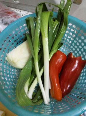 煮肉期间,洗净蒜苗,柿子椒,葱头,切换备用