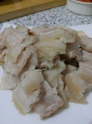 将煮好的五花肉洗净,不然切时会很烫手,五花肉切成薄薄的肉片备用
