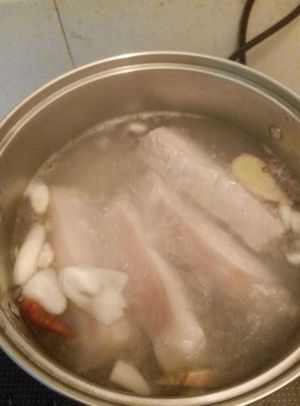 将五花肉切条洗净,加葱段,蒜瓣,姜片,辣椒,盐煮20分钟,煮至一根筷子可以穿过五花肉!