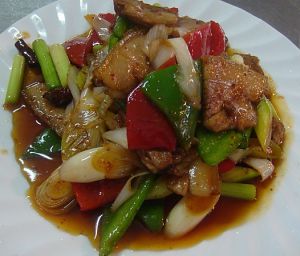 锅烧热,把过油的肉片放入锅中,放入青红椒、大葱炒香,再加入酱油,料酒,姜末,白糖,辣椒酱,味精翻炒,最后加入青蒜翻炒即可。