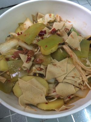 先放不容易熟和入味久一点配菜,土豆,莴笋,豆皮,白菜根