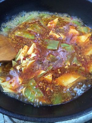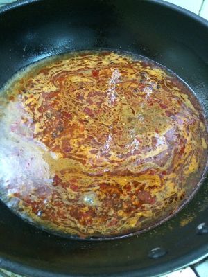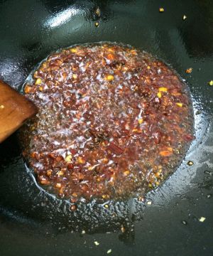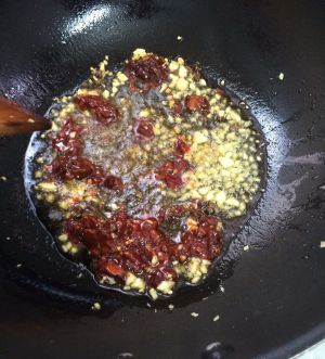 放花椒粒和一大勺豆瓣酱,小火炒出红油